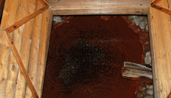 Über der Quelle ist eine Hütte gebaut, durch eine Falltür im Boden gelangt man an das Wasser. |