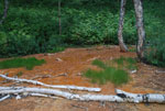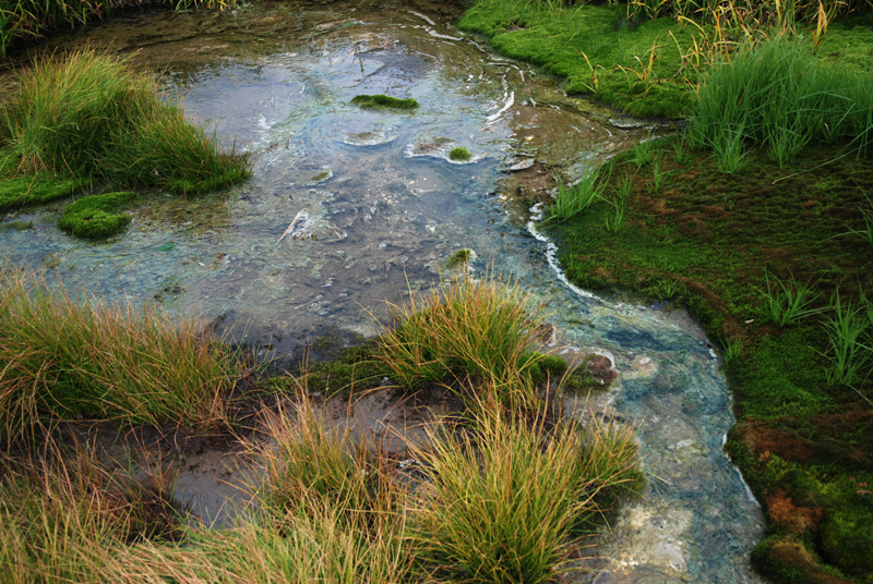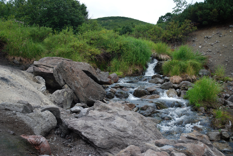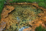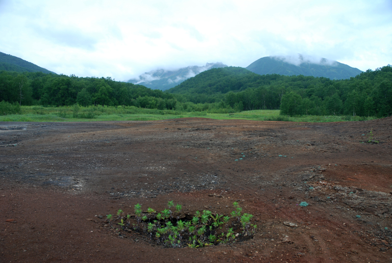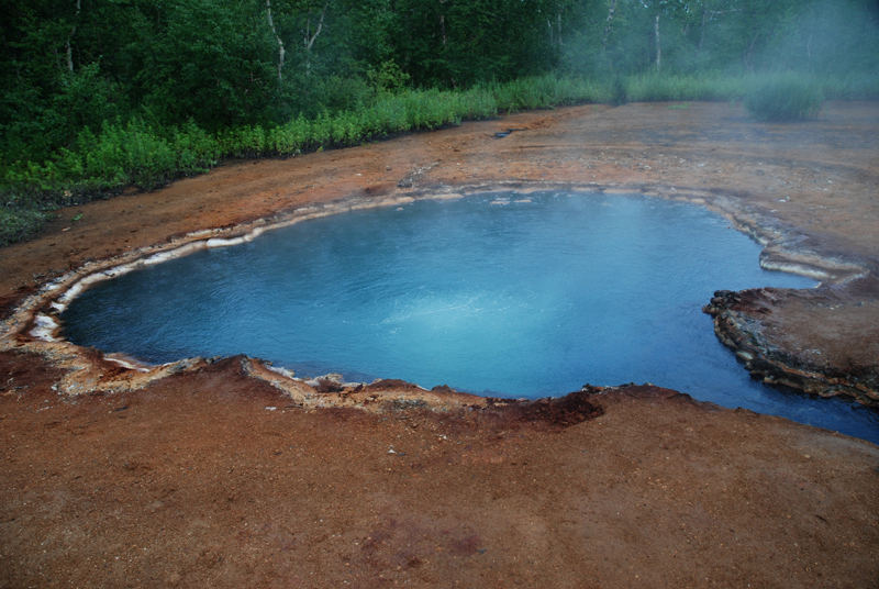 am Nalychevo-Camp. Ein etwa 200 m tiefes Loch, aus dem 71°C heisses