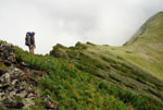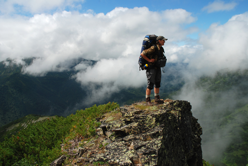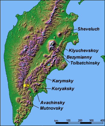 nord-süd verlaufender Gebirgsstock in Zentral-Kamtschatka. Ausgehend von der Piste nach Milkowo lässt sich das Gebirge leicht innerhalb eines Tagesmarsches (ca. 25 km) erreichen. Bei km 145 (etwa 20km südlich des Dorfes Ganali) am Fluss Vaktan Malkinskij folgt man einer Fahrspur nach Osten. Die Fahrspur beginnt direkt am nördlichen Ende der Brücke. An einem mit X markiertem Baum biegt der Trampelpfad nach Norden ab zu dem wohl schönsten Klettergebiet Kamtschatkas. |
